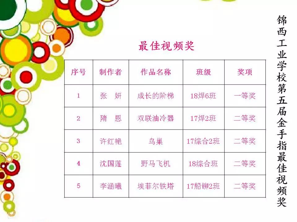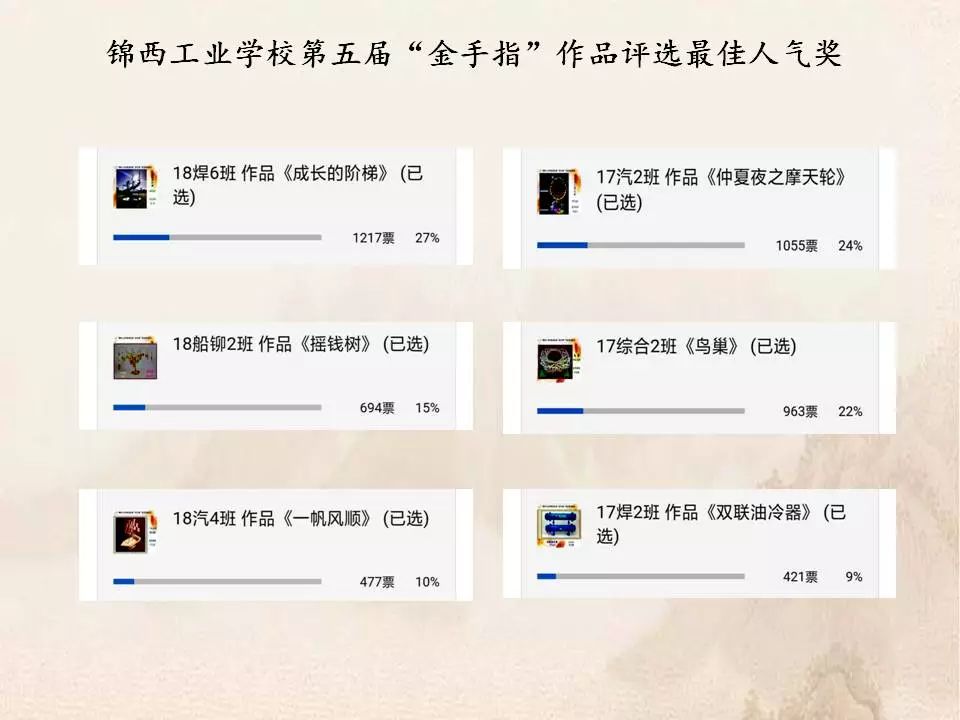 锦西工业学校金手指技能作品设计制作活动是我校的传统品牌活动,第五届“金手指”作品大赛的作品择优筛选出37个学生作品,12位优秀教师作品,经过专家评审、网友投票,最终选出: