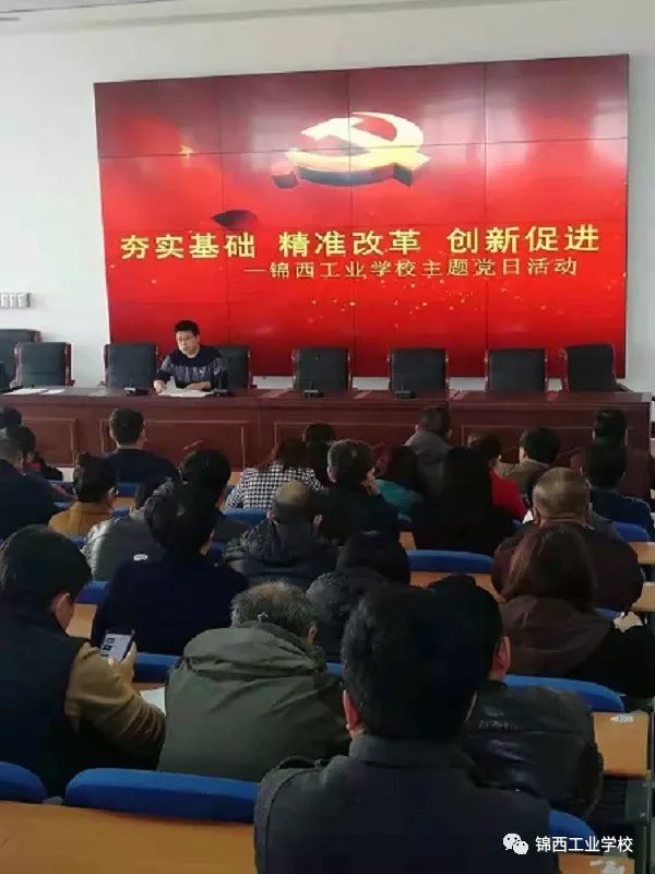 首先,锦西工业学校党委完成顶层设计,出台《锦西工业学校加强党建工作实施方案》、《锦西工业学校党支部规范化建设实施方案》、《锦西工业学校党委开展“党员示范岗”创建活动实施方案》等支部标准化、规范化建设相关文件,开展“夯实基础 精准改革 创新促进”主题党日活动,凝心聚力,统一思想,吹响支部标准化、规范化建设的号角。
