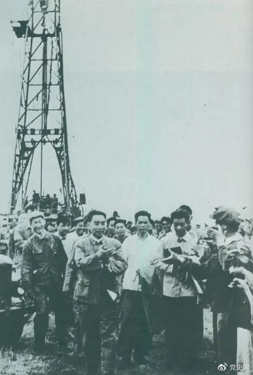 1962年6月,周恩来到大庆视察,这是在1202钻井队现场参观。