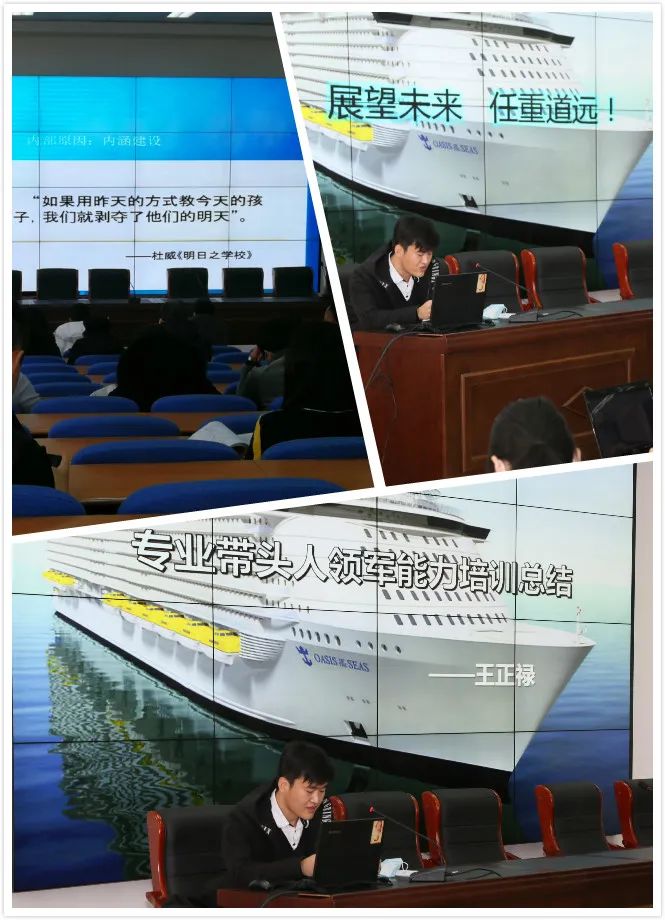 首先汇报的是王正禄老师,他参加的是“专业带头人领军能力”培训。他从技能传承、教育科研、团队建设的角度进行了分享,还重点介绍了自己市级名师工作室的建设。引发我们思考:一是把什么样的品牌和精神传承给学生;二是只要去尝试,教育科研并不难;三是教育教学不是一个人的孤军奋战,需要的是团队的分工合作。