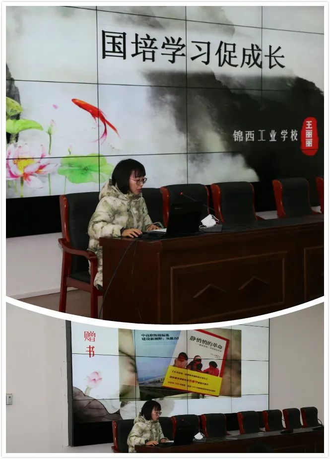 王丽丽老师汇报的题目是“国培学习促成长”,她详细介绍了参加培训的过程和学习内容。通过半个月的培训学习,她更深的了解了课程思政、1+X、三全育人、三教改革、班级管理等内容,更新了观念,开阔了视野,增长了专业知识。她希望通过努力可以遇见更好的自己,开启科研之旅,成为一名优秀的班主任。