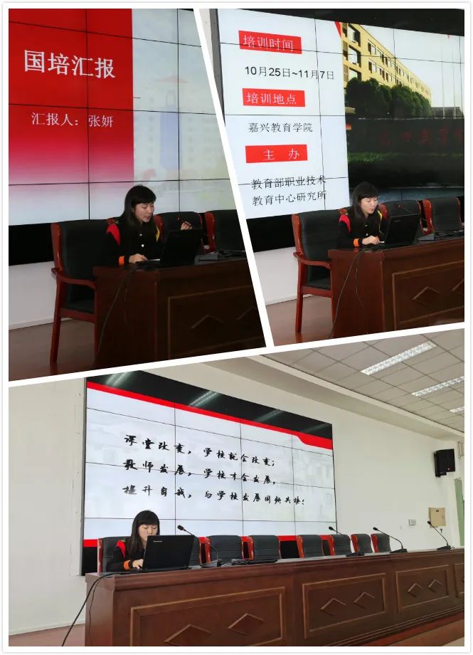 张妍老师参加的也是“专业带头人领军能力”的培训。她从知嘉兴、学在嘉兴教育学院、名师大咖云集、参观考察、读书观影等方面作了分享。重点讲了自己的感悟,南方职业教育与产业的深度融合和链上教育,让她感受到思想火花的冲击;专家学者的科研精神和班级管理经验,让她看到努力的方向;培训学习让她开眼界、拓思路,重要的是有行动。她用三句话来和大家共勉:课堂改变,学校就会改变;教师发展,学校才会发展;提升自我,与学校发展同频共振!