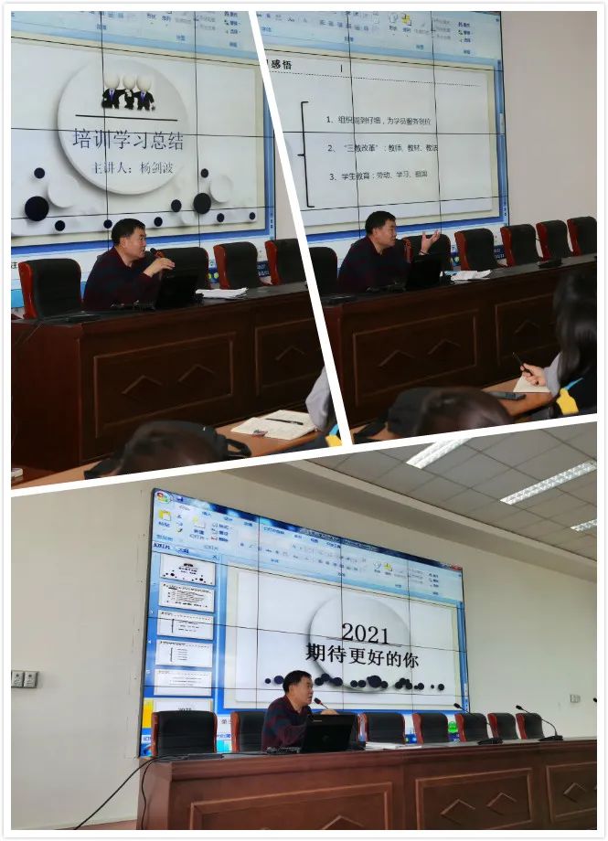 杨剑波校长分享的是参加“骨干校长培训项目”的总结体会。他结合学校发展实际,重点讲了班级团队建设、三教改革、学生教育。他希望班级多开展团建活动,提高凝聚力;三教改革要切实际、重实效;在做好大教研的同时,开展好小教研;教育学生从爱劳动、爱学习、爱家人做起,没有小爱哪有大爱。他还介绍了职教发展模式,让我们对应用本科这一技术教育概念有个初步的了解。最后,他希望可以“期待更好的你”。